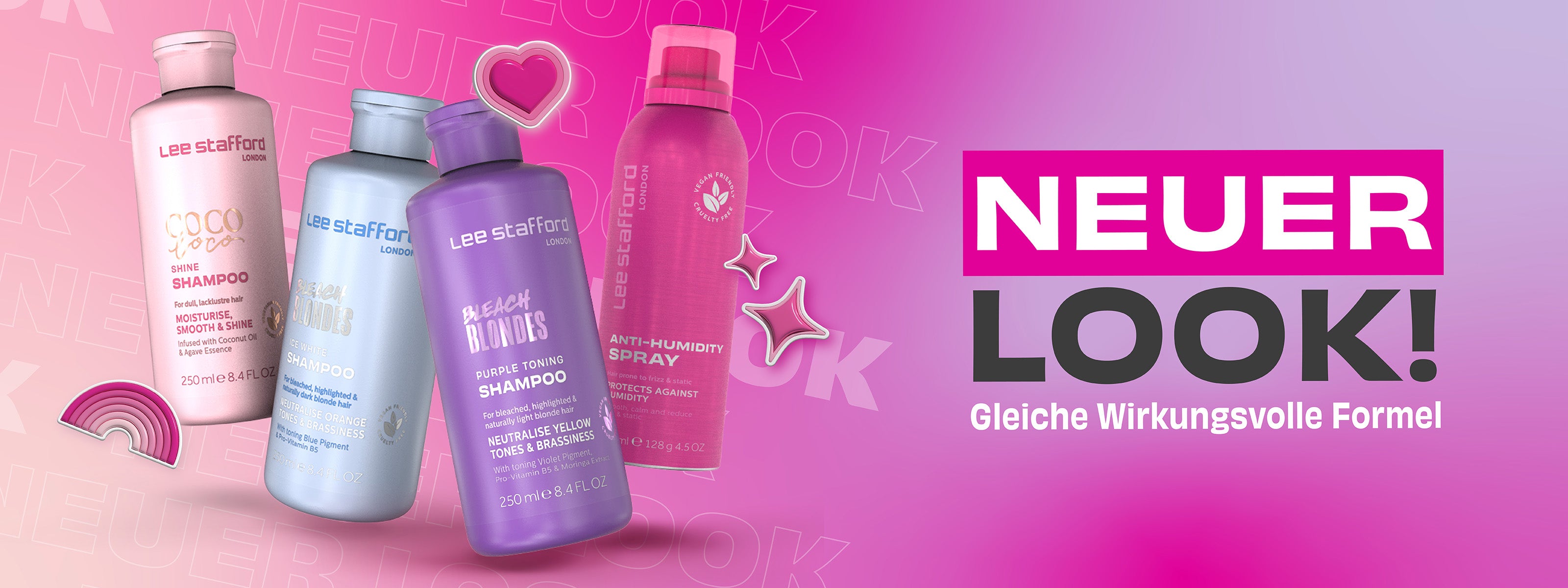 Lee Stafford startete 2001 in Boots in Großbritannien. Bekannt als die ‚rosa Marke‘ kennzeichnet die Marke kühne und skurrile Verpackung mit einem Barcode auf der Vorderseite der Packung, einige sehr ungewöhnliche Schriften und skurrile Produktnamen. Die Marke hat sofort Aufsehen erregt! Seitdem haben wir weiterhin ein sorgfältig zusammengestelltes Angebot an leistungsorientierter Haarpflege mit kultigen und innovativen Produkten entwickelt. Egal, ob du dein Blond stärkst, deine Locken definierst oder krauses Haar zähmen möchtest, wir haben eine salonfähige Qualitätslösung für jeden Haartyp und jedes Haarproblem. Wir haben es dir leicht gemacht, deinen perfekten Style von zu Hause aus zu schaffen und deine Mähne zu besitzen!