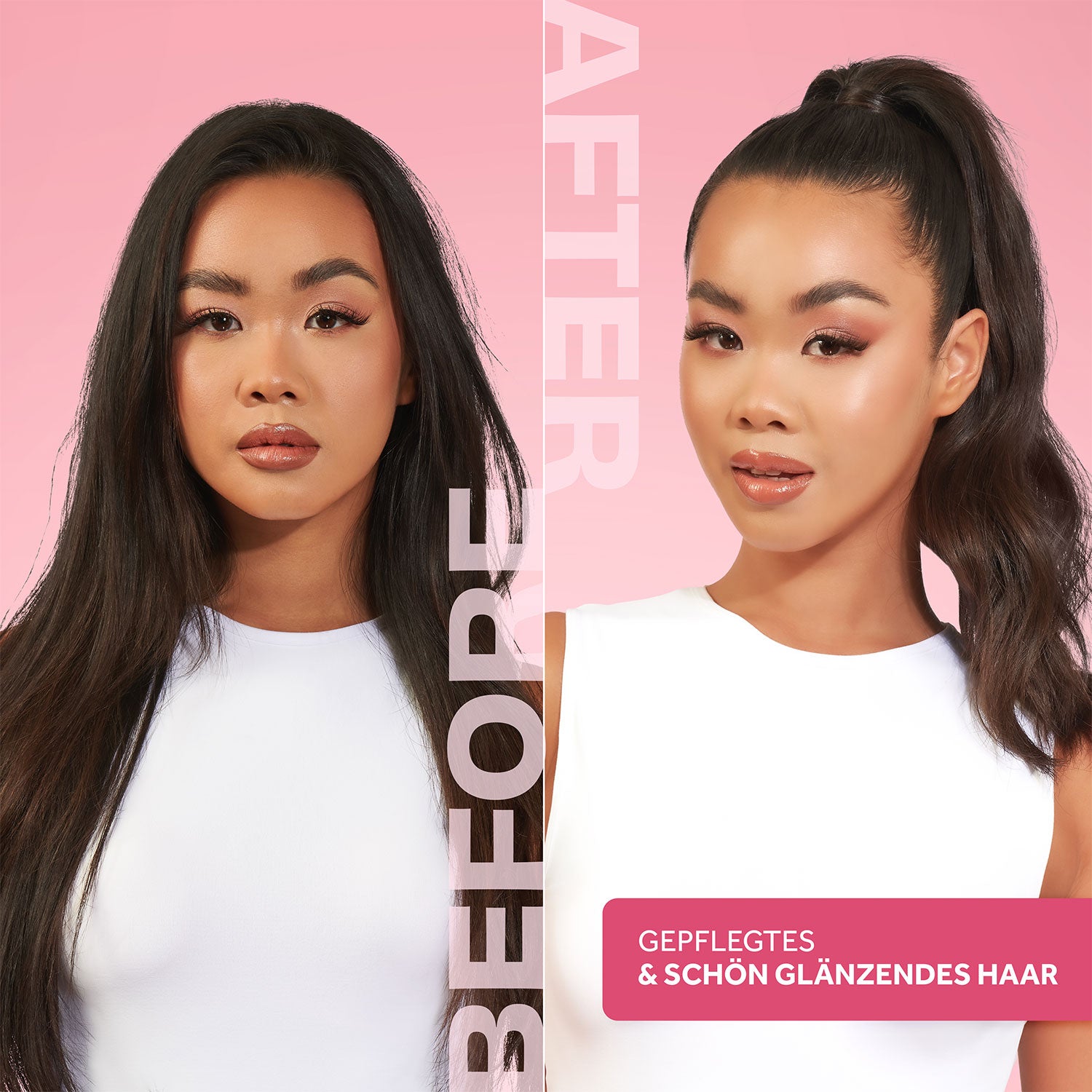 Verwende diese intensive Behandlung bei jeder Wäsche, bis sich der Zustand verbessert. Wende sie dann einmal pro Woche an, um das gesunde, schlanke Finish des Salons aufrechtzuerhalten.