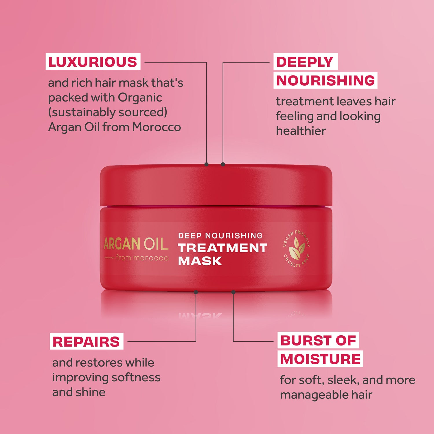 - Ist es das Richtige für mich?: Unsere beliebte Argan Oil Deep Nourishing Treatment eignet sich am besten für trockenes, grobes, natürlich dickes oder krauses Haar, das zusätzliche Feuchtigkeit und Nährung benötigt.